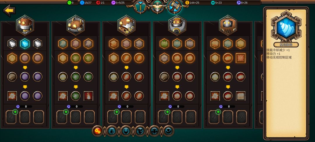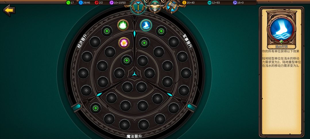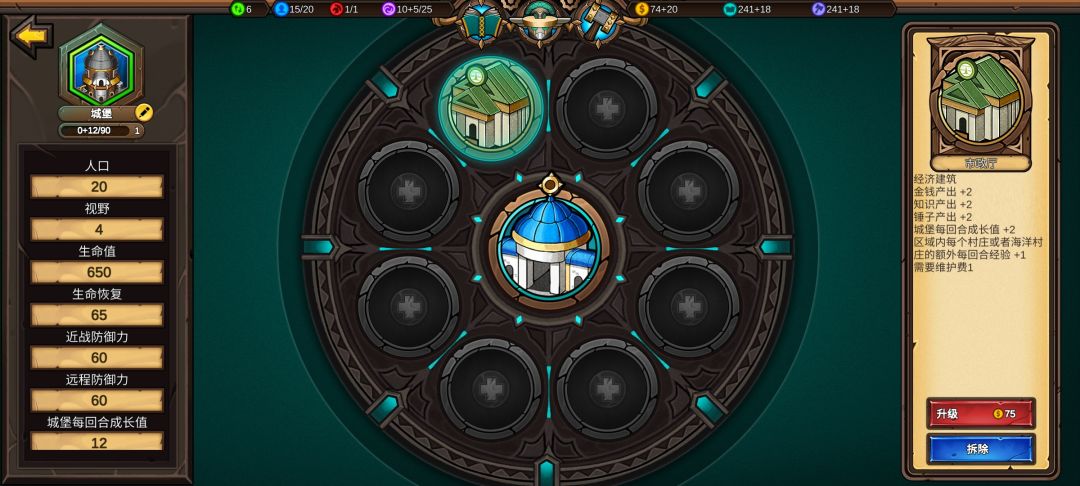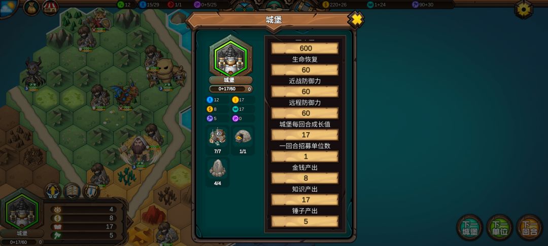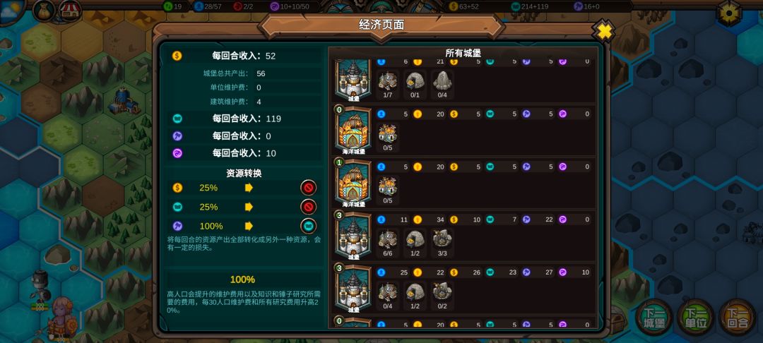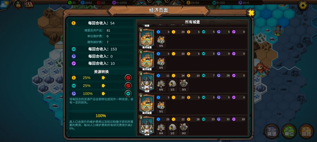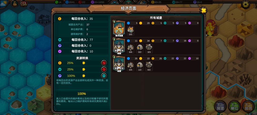 十四:收复第九回合没人要的海洋城堡,打开左上角钱袋,将锤子转换为知识,知识收入从29跳到77