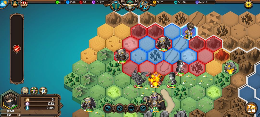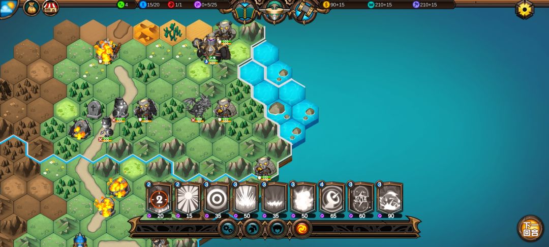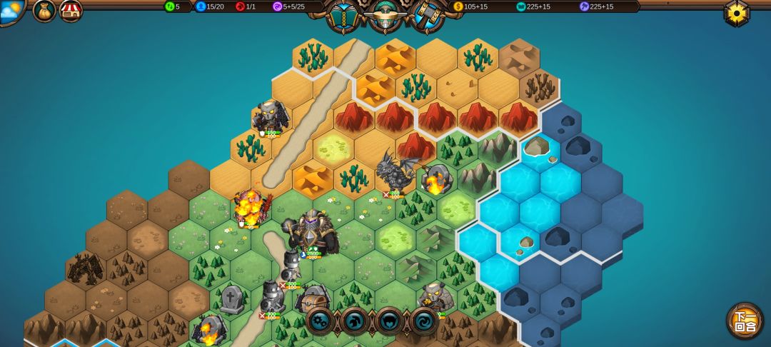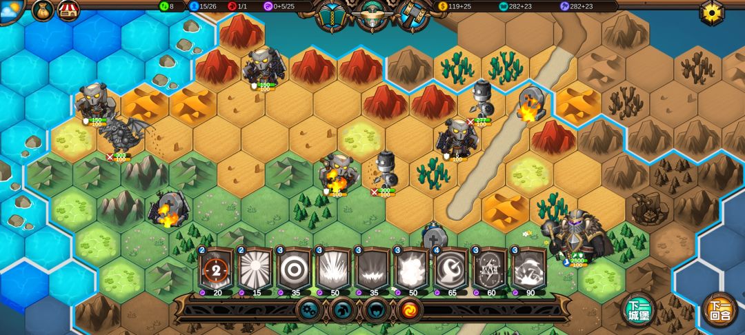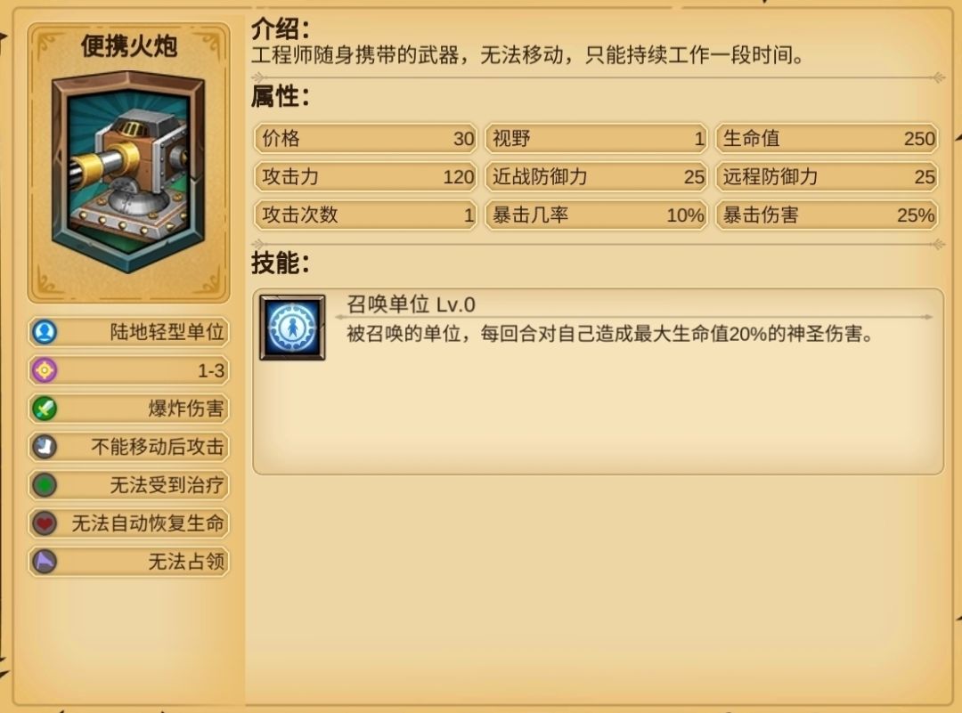 把火炮扔在丘陵上加15%伤害,召唤单位技能对自己造成23%最大生命值的神圣伤害,不受攻击的情况下炮塔可以存在4回合