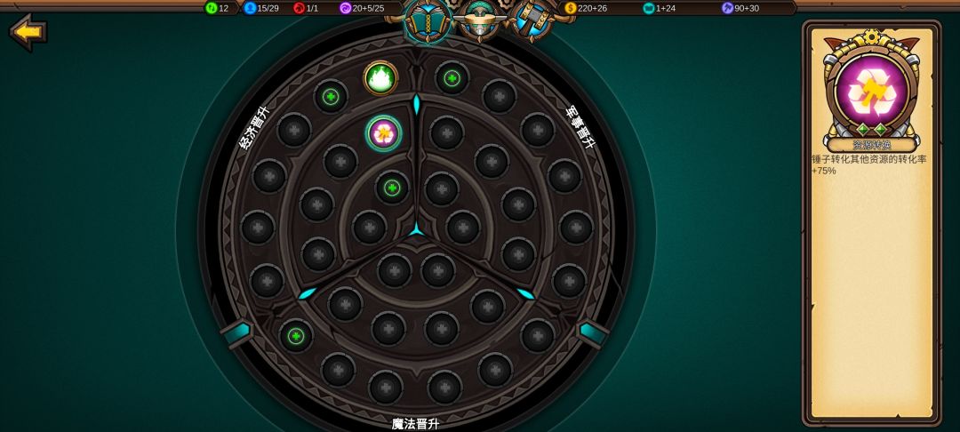 前期点出资源转换把锤子转知识可以快速升知识盘科技,知识盘科技提升可以进一步提升收入和战力