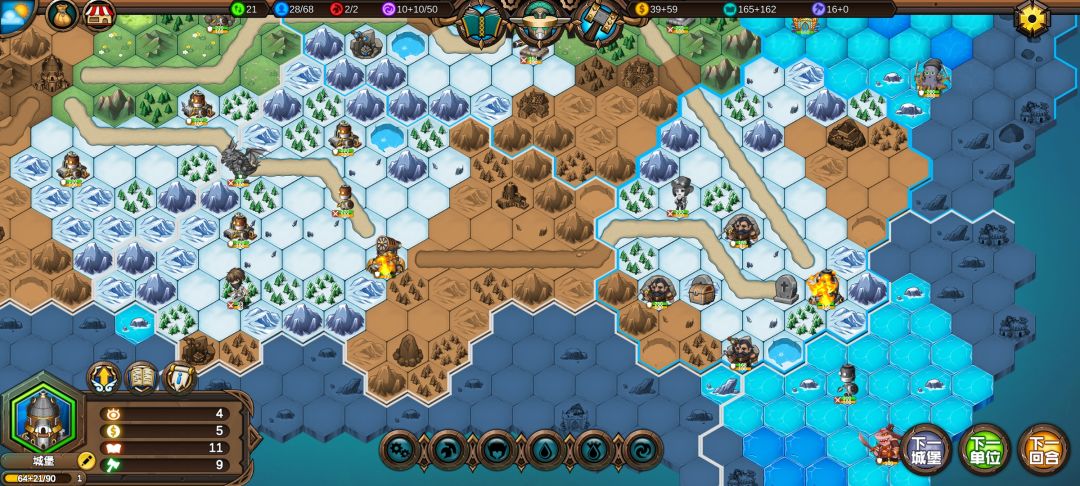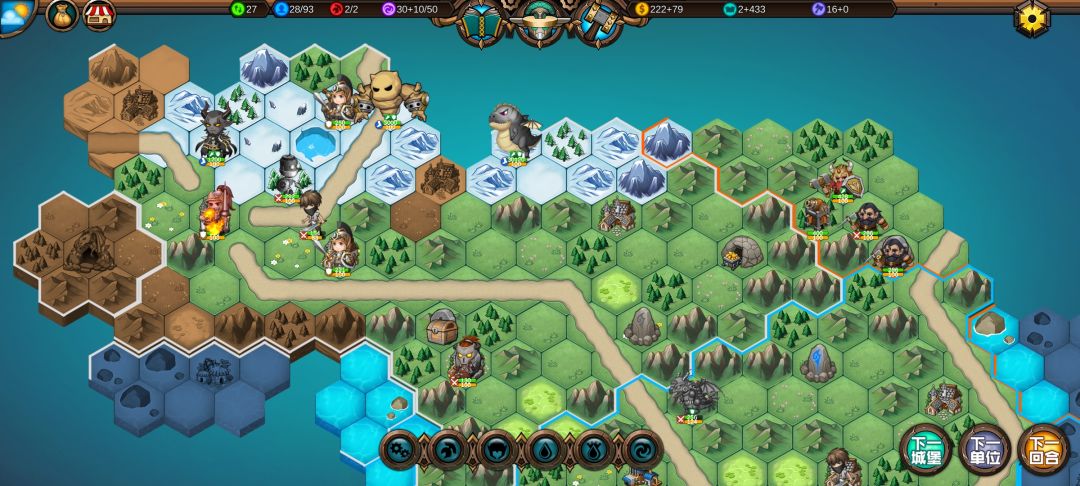 中间局势,精灵的弓箭手有4点射程,好几个弓箭手在A城堡