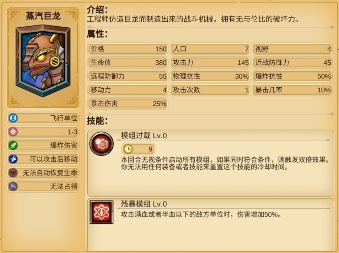 启动模组过载后,就拿下面的残暴模组来说,无条件使伤害增加100% ,如果蒸汽巨龙的技能等级有10级,那么就是150% ,加成极高