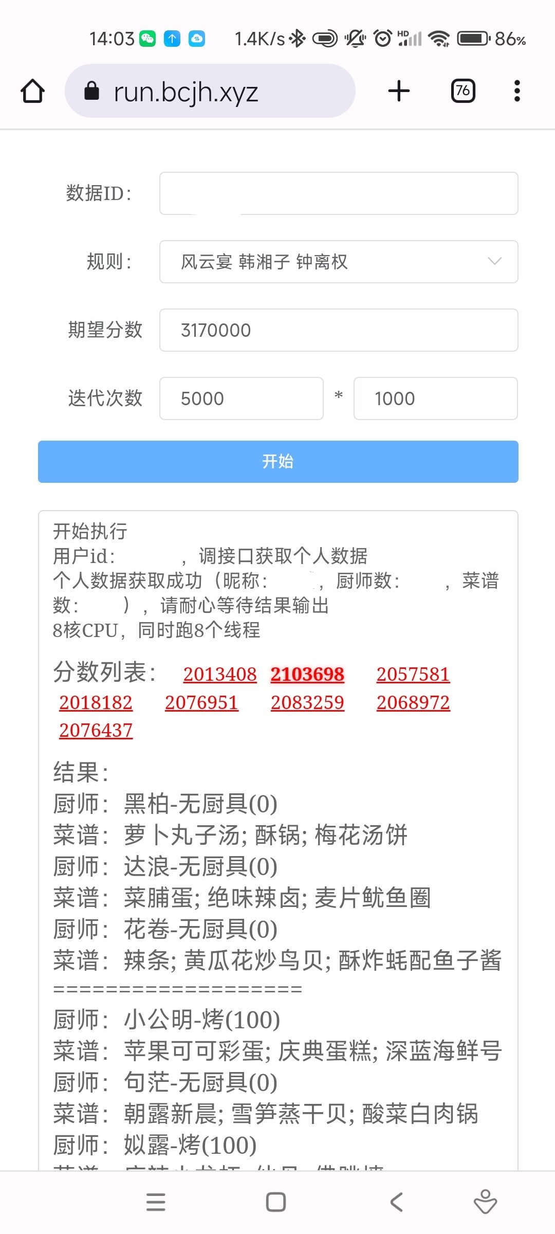 不需要每周手动下载,输入白菜菊花id即可用可自选规则、设定迭代次数,自动多线程,还可以查看每个线程的各个结果。主流浏览器都能用(IE和古早版本Safari除外),如果能用白菜菊花计算器,那么这个应该也能用。可以不用发帖求助,自己想跑多少次就跑多少啦。如果有没看到链接的朋友也可帮忙指路~