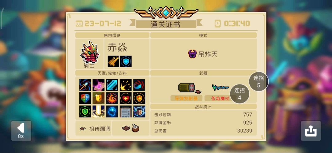 哟西,这boss也太难了,精灵,游侠,都死了(过不了),这一把选骑士,又比较胡,直接秒了(拖久了那个落石都不知道怎么过)结束时从4-1结束变成4-6结束了,而且神圣新星(种植物的天赋)和苍龙法杖也全程没用上,有点遗憾