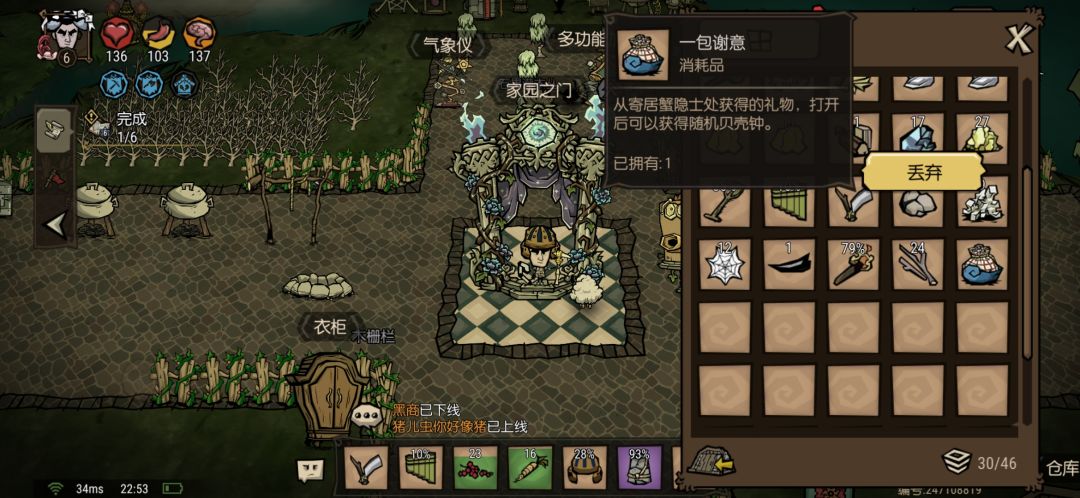 环境美化任务:杀掉一个食人花球茎,包括玩家种植的。到春天这座岛上必然会出来一个食人花球茎。清除岛屿周围所有的海蚀柱和水下不明物体。清除水下不明物体需要花费1个瓶子换取绞盘蓝图,并在船上建造绞盘。打捞上来后是一个贝壳堆,镐子可以挖掉,只给大量贝壳钟。(注意:绞盘交易是老奶奶附近打开制作书,看图6和图7)