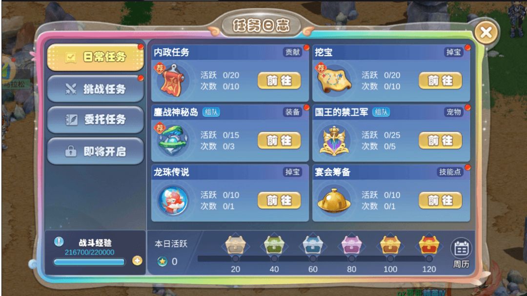 游戏里的日常任务分为6种,分别是内政任务、挖宝、狩猎任务、龙珠传说、鏖战神秘岛、国王的禁卫军、宴会筹备等这11种。这个挖宝活动在游戏界面上方的日常任务里面。