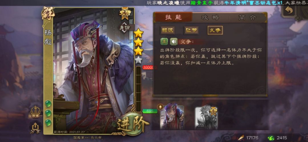 杨彪,字文先东汉末年名臣,太尉杨赐之子、杨修之父,出身东汉名门弘农杨氏黄初五年(225年,杨彪去世,享年八十四岁。在游戏中杨彪是一位史诗级武将,其实力也符合这个身份。杨彪在游戏前四个回合可以共增加4点体力值非常的肉,当杨彪受伤后还可以移动场上的装备牌或者获得指定卡牌如:锦囊牌、装备牌。