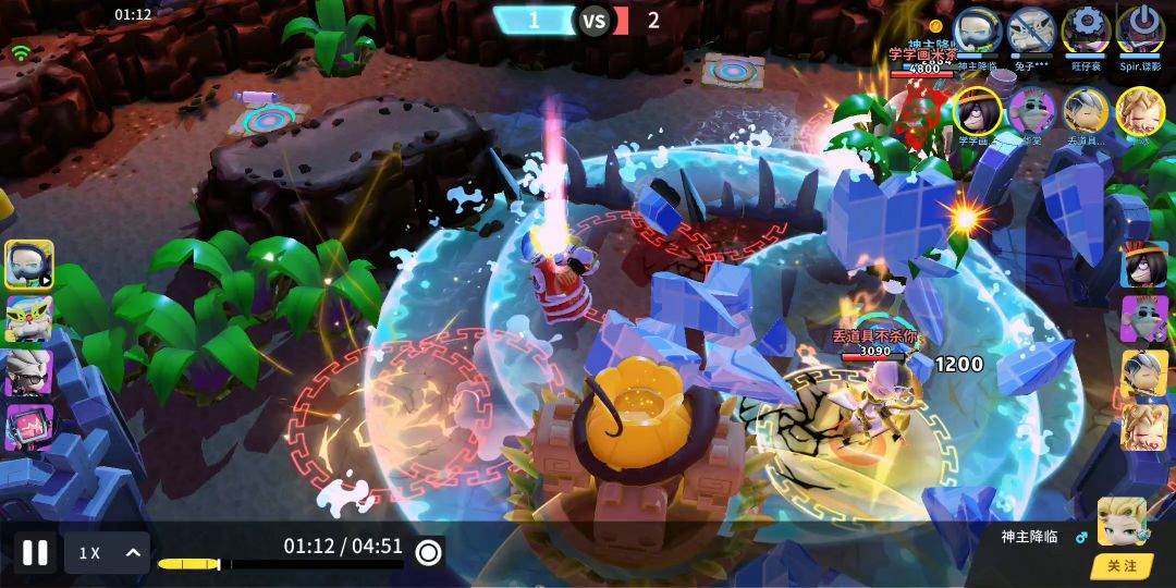 视频里在滴滴打枪跳到1秒的时候,土地公释放大招,然后被电磁炸弹打断了,这时候大招余波杀死了小怪兽进行了大招循环。