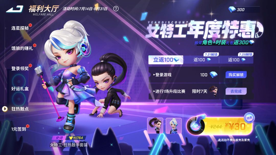 (1)未拥有角色-女特工的少年,可以30元折扣价购得女特工(原价680钻)+女特工-狂热鼓手套装(史诗),并全额返还300钻。