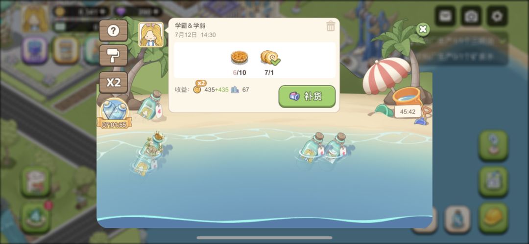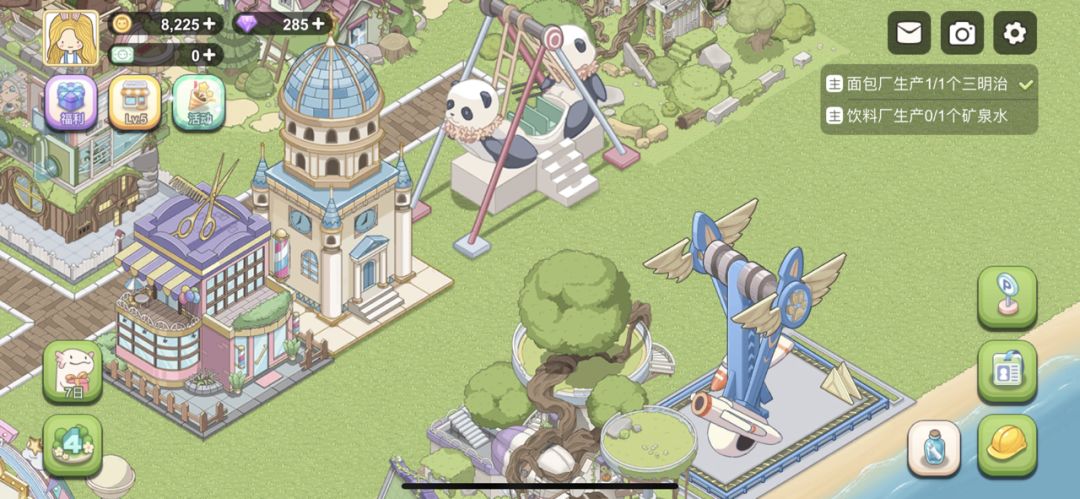玩法上就是造工厂生产,产品通过漂流瓶订单得到钱和经验,热气球飞艇订单给材料,然后就是装扮。风格是挺好看的,是我最喜欢的风格,小动物也很可爱,他们的作用是缩短时间。生产建筑是超级可爱的树,小动物在下面给树浇水,然后树就会生产面包蛋糕。