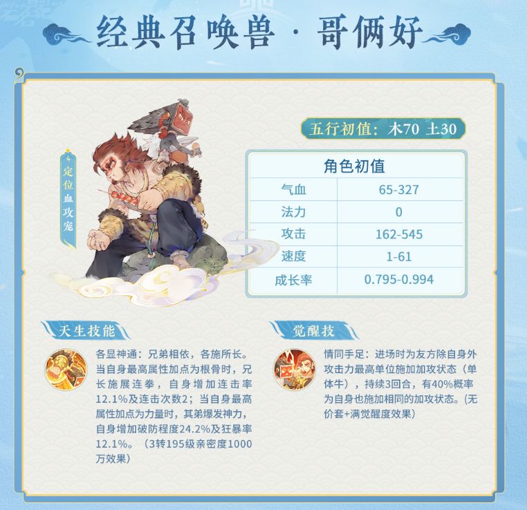 气血初值最高327,已经表明“哥俩好”是特殊召唤兽里面最肉的一个物理输出宝宝,因为它的气血初值比福犬还要高。