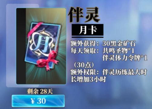 月卡商店新增伴灵月卡,购买解锁每日道具奖励和额外权限,伴灵养成更迅速~