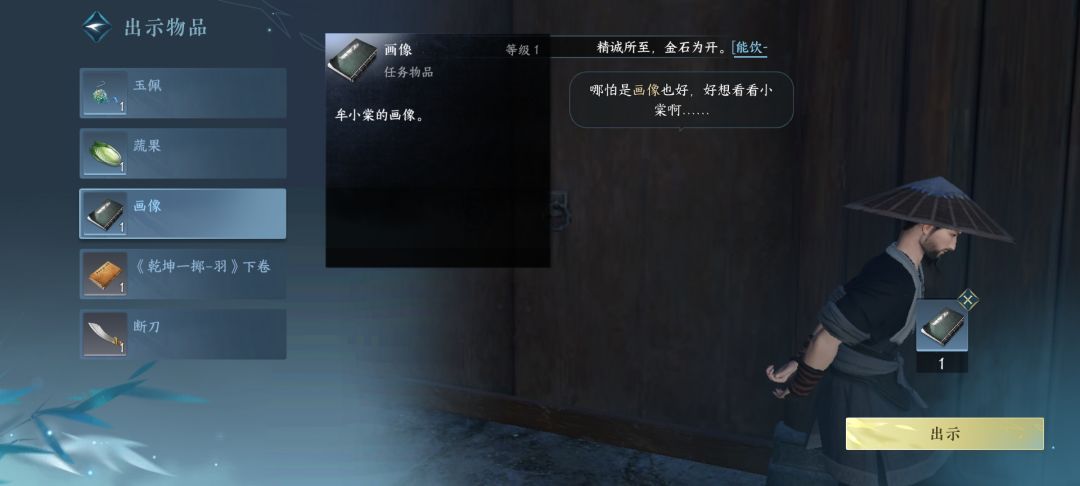 2.【少年侠气】(【谁有不平事】的后续)在(976,829)对话牟小棠,之后在谪仙岛(545,725)遇到他,给他画一幅画像(动作-作画),回到杭州(974,827)把画像给他父亲。