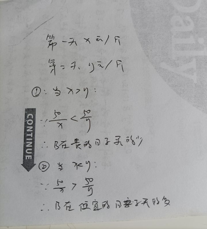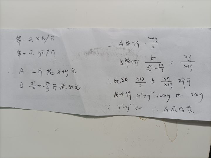 总之,无论哪种情况,B都是在大米价格较低的那一天买的更多。这就意味着B能够根据大米的价格变化来调整购买量,从而使总花费更少。因此,在这个问题中,B的购买决策永远好于A。
