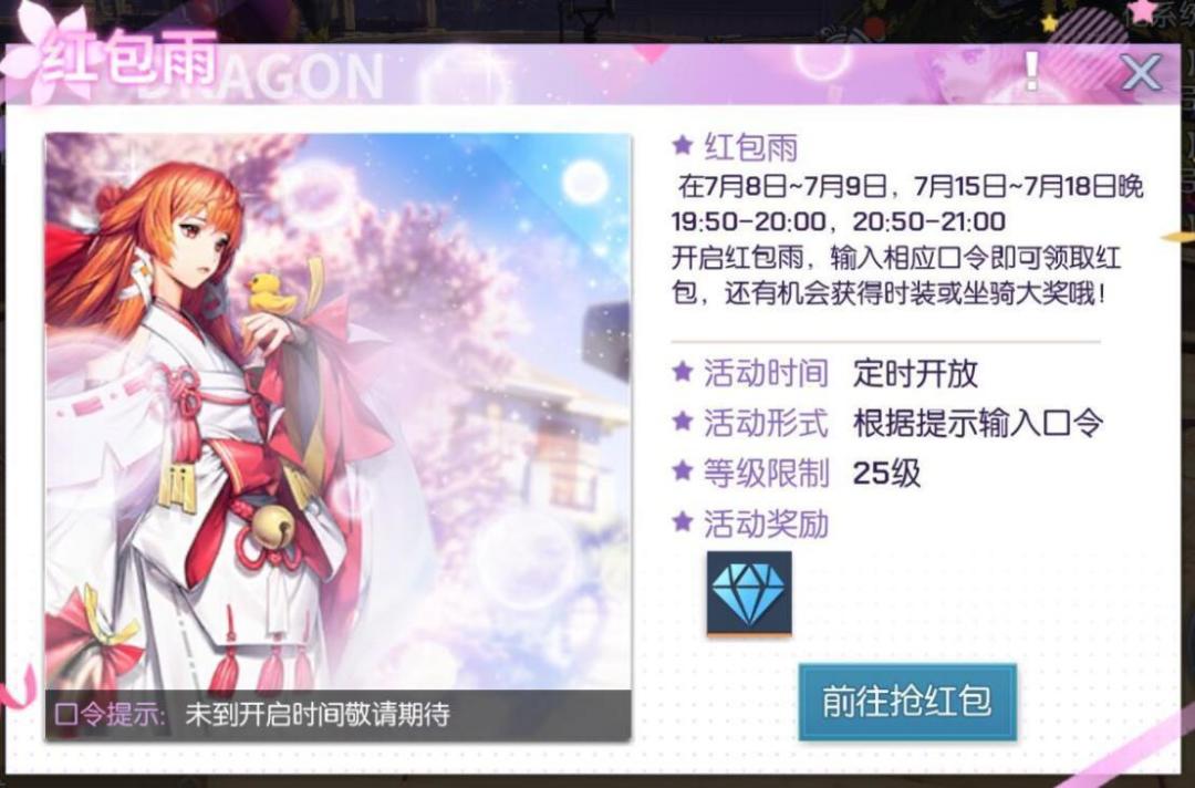 在7月15日至7月18日每日,晚间19:50、20:50将会各开启一轮红包雨,输入正确口令后可获得大量钻石,执行者们都准备好接红包的手了吗?