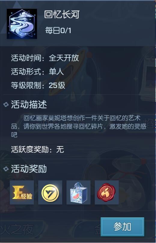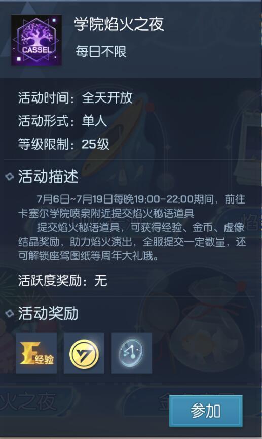 7月13日~7月19日晚间19:00-22:00,25级(含)以上的执行者快到卡塞尔学院找到活动使者莫思夜吧!从这位使者手中领取任务“相遇·四载”,就能拿到经验、金币、萤火之夏礼盒、龙魂之力等一次性奖励哦!