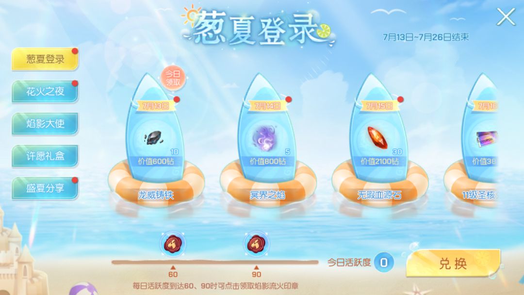 周年庆典开启,又怎能少了登录豪礼呢?7月13日~7月26日期间,每日登录游戏就能领取,无瑕血源石、11级圣核兑换券、3级龙蜕精华、进化石、10级精神圣核……应有尽有哦~