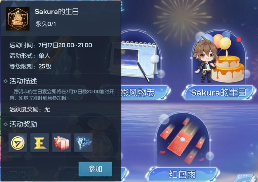 7月17日是路明非师兄的生日,当晚20:00,生日会将准时开启,执行者们一定会为Sakura捧场并送上祝福的对吧?25级(含)以上的执行者参加生日会,就可以收到路明非为大家准备的丰厚庆生礼啦~