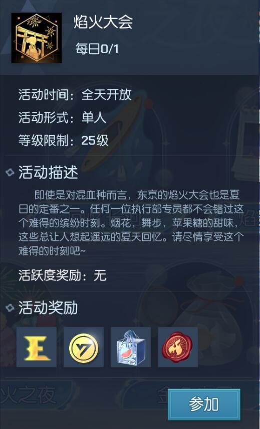 7月15日~7月16日期间每天的20:00~20:50,千鹤町海滩的焰火大会就将盛大绽放!25级(含)以上的执行者别忘了前往参加这场盛会,听说大会上还有惊喜等着大家哦!