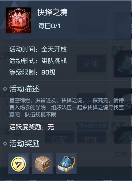 抉择秘境活动开启期间,等级不低于80级的玩家每日活跃度达到90时有50%概率获取一张抉择秘境入场券。