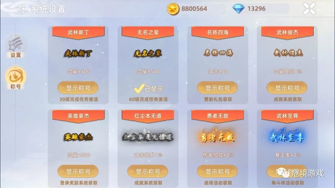 除了固定的称号外,还有限时称号,每晚7:40分开启的角斗场活动,第一名可以获得限时24小时武林至尊称号,暴击率加2%,获得后记得随便切换下称号会涨战斗力。
