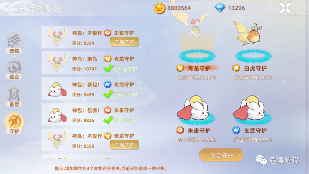 宠物分青龙白虎朱雀玄武四个守护,只以分数较高低,先凑齐4个属性的守护,再慢慢择优选用。