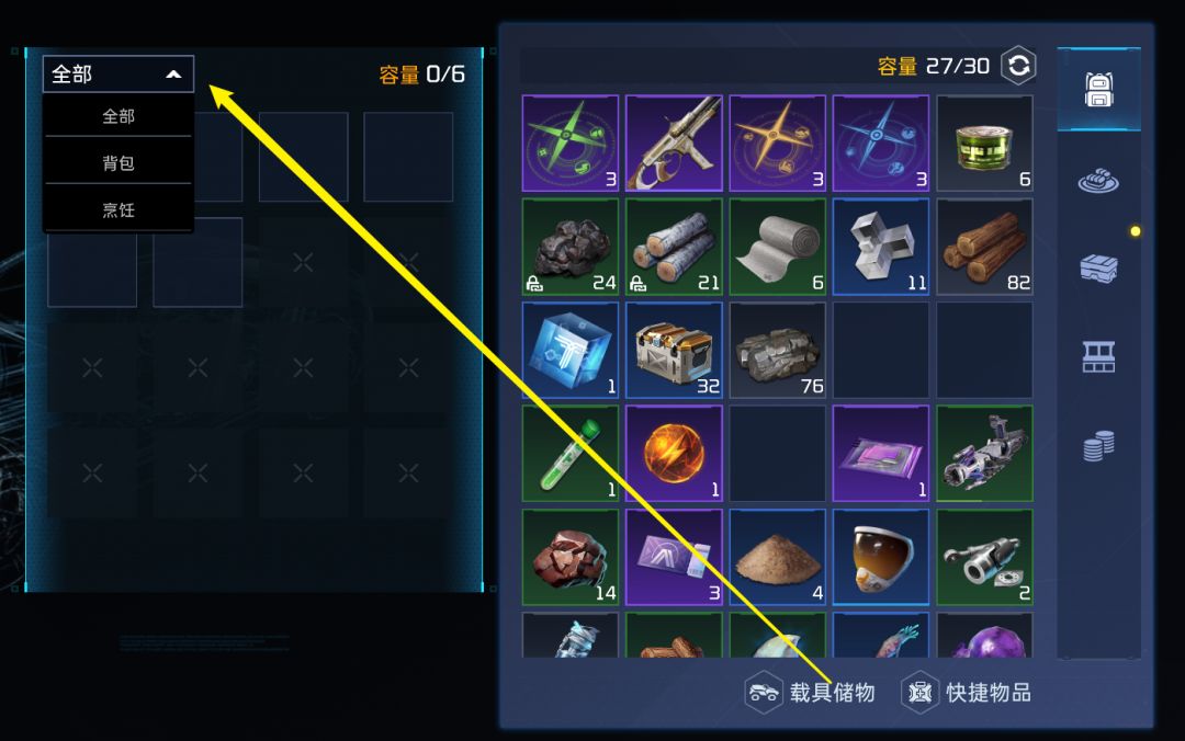 我们平时除了背包可携带一定数量物品外,还可将各类道具/烹饪存放到载具内。同时,载具储物栏也会随着我们解锁更多新的载具以及载具工坊的车架改装来进一步扩充容量。