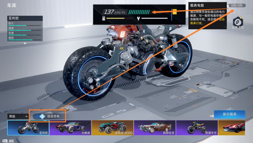 游戏里所有的载具都由电力驱动,我们在车库即可完成充电。同时,还可将载具设置为自动充电,这样每次返回庄园便会立刻将载具电量充满。