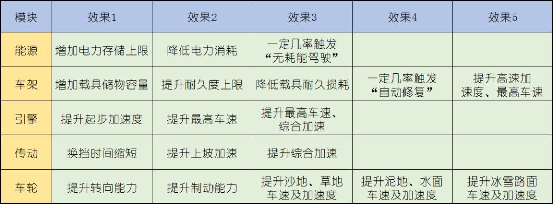 幸存者达到37级后便会解锁载具工坊玩法,可以通过车库进入载具工坊的改装界面。改装分为五大模块——能源、车架、引擎、传动及车轮,这些改装效果都将对所有载具生效: