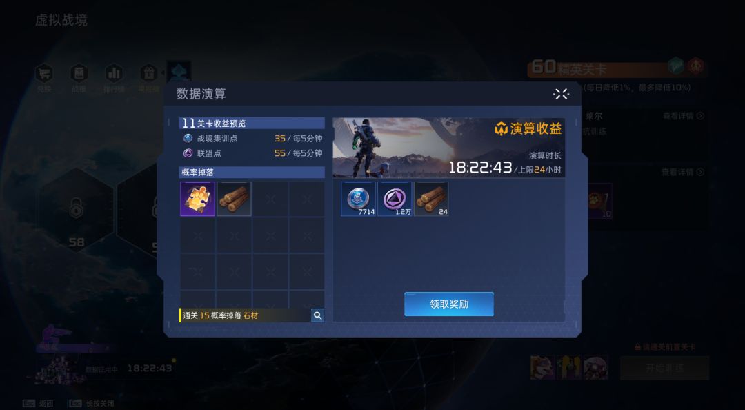 虚拟战镜会根据当前玩家挑战的最高层级给与材料奖励,其中还会概率掉落高级宠物召唤券碎片(十合一),以及大量的战境集训点、联盟币、木材等等。