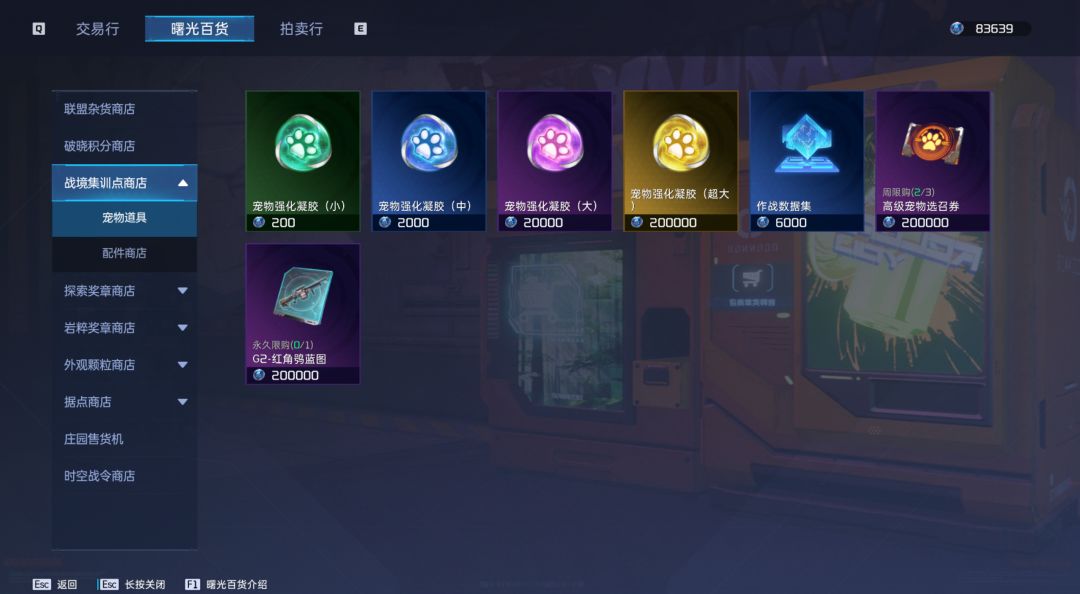 战镜集训点可以在对应的专属商城兑换宠物强化凝胶、作战数据集、高级宠物券和G2-红鹦鹉蓝图道具。
