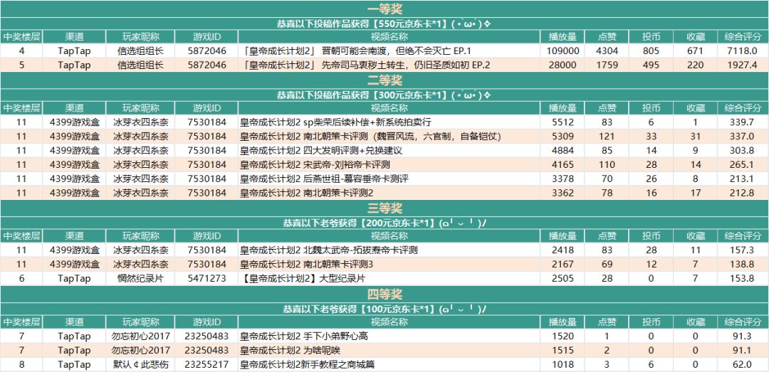 根据活动规则,我们综合播放及点赞等数据、内容质量等维度,评选出了以下获奖选手,奖励道具近期将直接发放到大人们的游戏账户中~