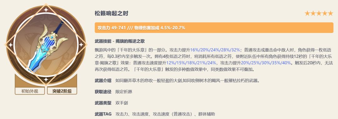 松籁响起之时作为优菈的专武,自然是毫无疑问的第一选择。然而其质量较差的741白值模板、与终末、苍古两把大乐章武器的冲突、攻速效果对大招叠层增益的局限性,都比较严重地限制了这把武器的上限,因此它并不能说它是一把提升多大的专武,在很多特殊情况松籁甚至未必称得上好用。