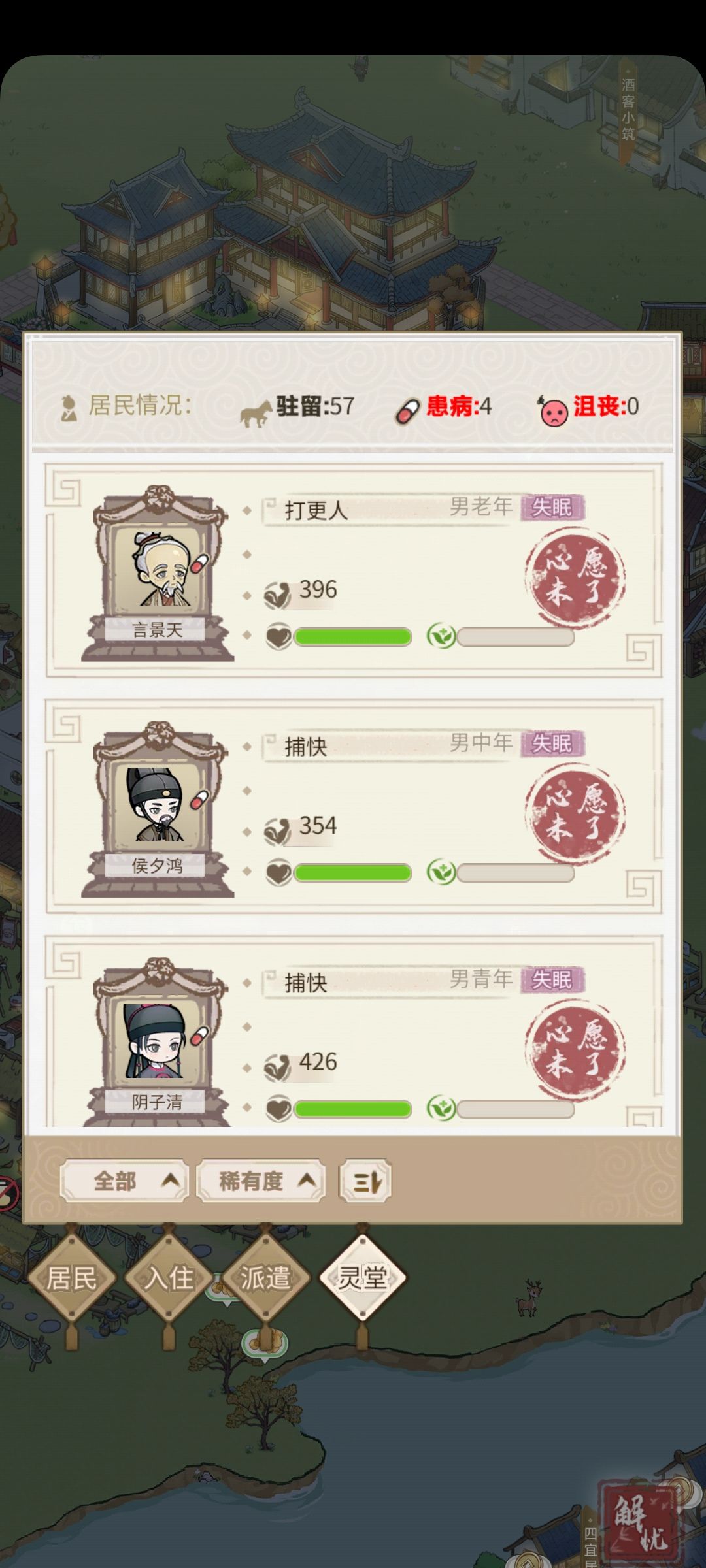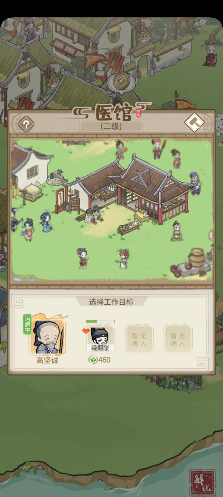 )2.很多人没看到医馆治病怀疑医馆的作用,特此上图,救治很快所以不容易逮到,健康值低于一定程度才会自动去看病,看病只会恢复一定健康值,解热散给失眠人加100健康值,龙沙饮25,加的多所以说解热散有奇效,健康值800会痊愈,但是更夫捕快只要工作就会掉健康值,所以送礼治病意义不大,有医馆就没问题。