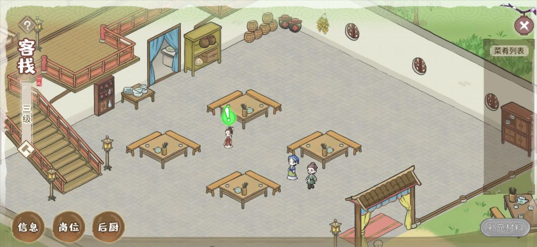 4.客栈招人,如图5,会有马夫女酒啥的偶尔来客栈供村长招募,可招募目标头上会有绿色感叹号。