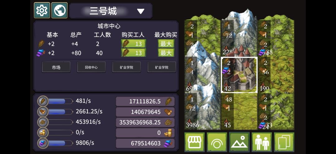 三号城高山多,是矿石基地,建钻机、珠宝商、矿学院等,卖矿换金币