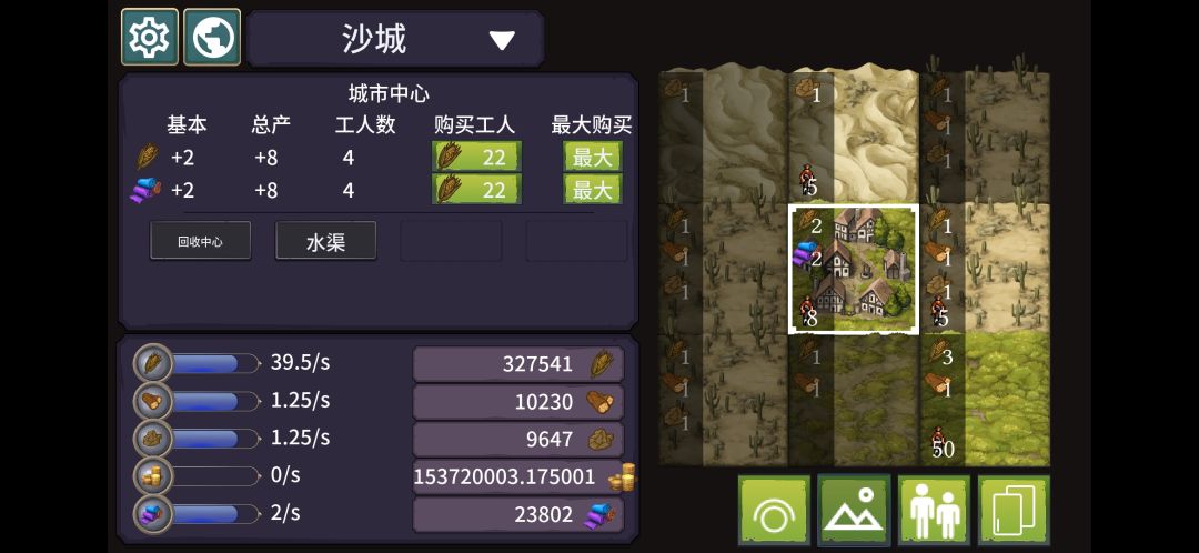 一号城原本是个综合城市,因为平原多,后来改成粮食基地了,因为用了养蜂人,每个平原4个水井是产粮最多的,城中心建了市场、回收中心、两个农学院,卖粮换金币