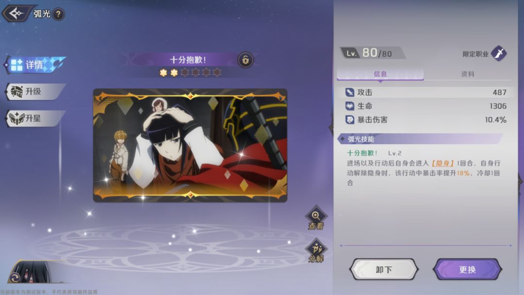 重点推荐弧光为【十分抱歉】,进场以及行动后会进入到【隐身】状态,行动解除隐身时,提高10%暴击率。该弧光可以大幅度的提高娜贝的生存能力,并且提高一定的输出能力,与其收割输出的定位契合度很高。