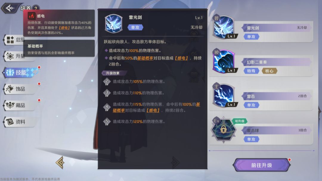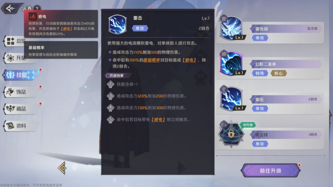 单体伤害技能,冷却2回合,造成高额的物理伤害,命中有有100%基础概率造成【感电】,技能2级时降低1回合冷却,技能5级时,目标若带有【感电】则立即触发。