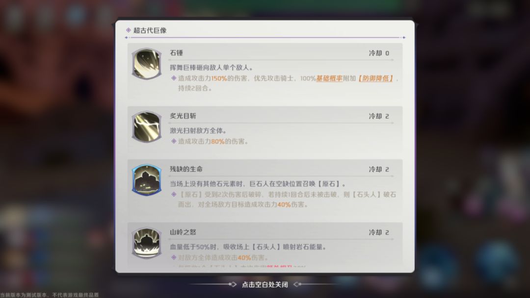 残缺的生命:当场上没有其他石元素时,召唤【原石】,【原石】受到1/2(随层数提高)次伤害后破碎,若持续1回合后没有被击碎,则造成全体伤害。