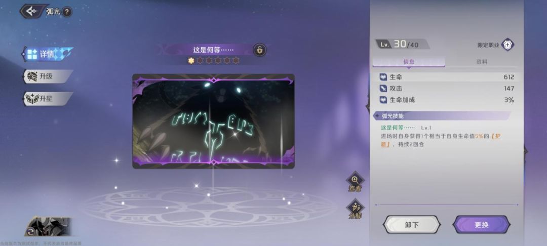 弧光推荐选择SR品质的【这是何等.....】,除了额外获得的大量生命值和攻击力,自身进场后将会获得1个相当于自身生命值5%的【护盾】,持续2回合。