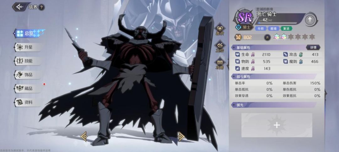 死亡骑士的品质为SR,职业为骑士,定位为保护,所属阵营为星蓝。在上图所示的角色面板中,我们可以看到他的生命、物防以及速度属性均为A,评级均比较优异,这样的属性能够让死亡骑士在团队中承担敌方大量的物理伤害,即便敌方即将释放一些高爆发的单体伤害技能,死亡骑士应付起来也是游刃有余。