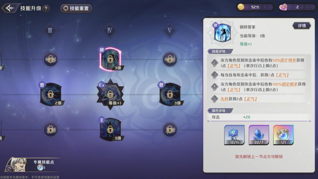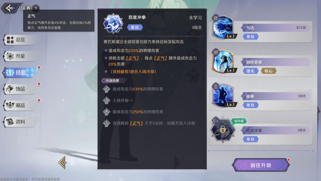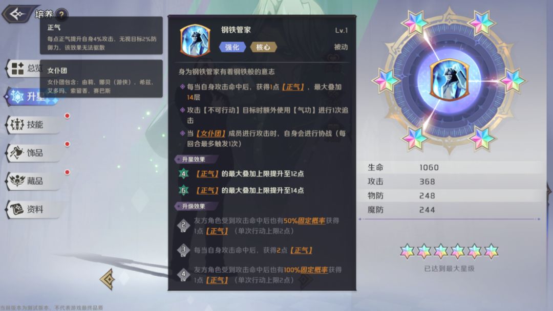 每次攻击命中获得1点【正气】,技能升级后,友方角色攻击时也有概率获得【正气】,当【女仆团】成员进行攻击时,自身会触发【携战】。【正气】:每点提高4%攻击,无视目标2%防御,无法被驱散,最高可叠加至14点。该技能为赛巴斯的核心技能,通过【正气】的叠加,大幅度的提高赛巴斯的攻击力和无视防御能力,使其能够打出高额的真实伤害,无论面对脆皮输出还是肉装坦克都可以轻松应对。
