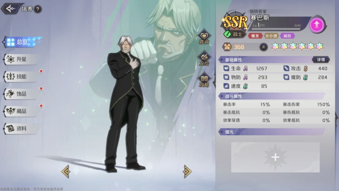 赛巴斯在4/6星时,可提高【正气】的最大叠加上限,6星可叠加14层【正气】。星级越高,则赛巴斯可以获得的伤害提升就越高,但即便是低星级也可以触发EX技能,因此赛巴斯只要抽到就可以上场,并不需要专门等到高星级才能使用,可以说前中后期都能作为队伍的核心输出。