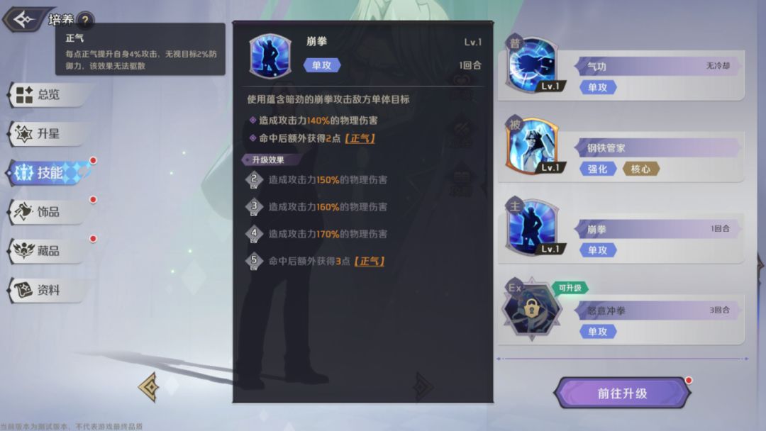单体物理攻击,冷却3回合,造成高额的物理伤害,消耗全部的【正气】点数,每点【正气】额外造成攻击力20%的伤害。该技能5级时获得新的效果:消耗的【正气】大于8点时,技能不进入冷却。高爆发技能,本身拥有极高的伤害比例,还可以消耗【正气】获得额外伤害,技能5级以后可以同一回合使用2次,打出爆炸输出,针对boss具有奇效,在竞技场中也可以体验一拳秒人的快感。