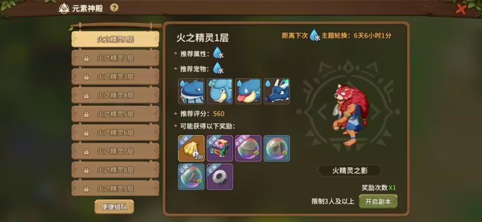 元素神殿:虽然可以无限参与,但每层只能获得一次奖励。进行挑战需要选择克制该神殿的属性和宠物属性,《石器时代:觉醒》中元素属性分为火、风、地、水四种属性,火克风、风克地、地克水、水克火,克制的元素最高可以造成130%的伤害,而被克制的属性最低只能造成60%的伤害,所以属性的选择很关键,尤其是在几人组队的情况下,不仅要保证阵容的合理性,还要选择克制该元素的属性,最起码也要选择没有克制关系的属性。
