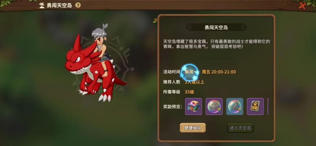 勇闯天空岛:需要我们挑战守卫,进入更高层次,在对应的层次中,挑战随机刷新的怪物,获得掉落的宝箱,并通过队伍摇点获取,所以运气和实力缺一不可。这个没什么可注意的,主要看整体实力。
