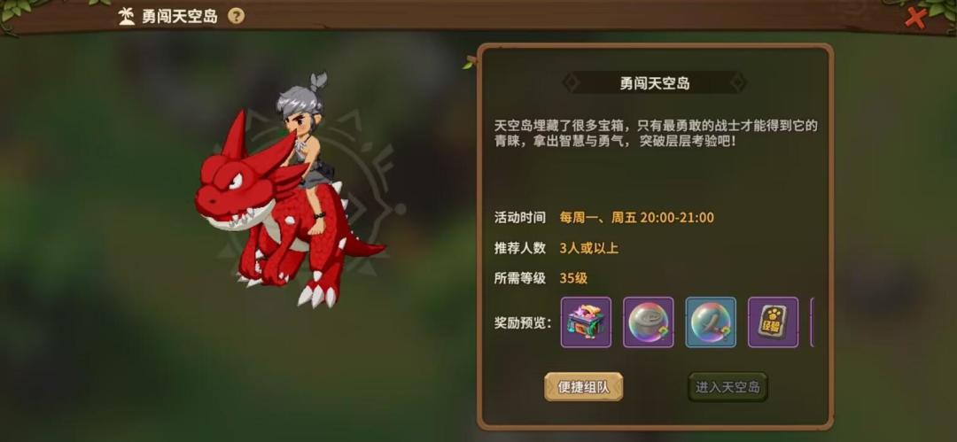 每周一和周五开启的勇闯天空岛,是获得各种稀有道具的主要途径,需要玩家组队进入活动。此活动分为九层,在活动地图内会随机刷新各种箱子,而击败怪物就可以获得各种钥匙,使用钥匙打开对应的箱子就可以获得buff或各种道具。天空岛的层数越高,奖励就越丰厚,击败每层的守卫,即可前往更高层次。