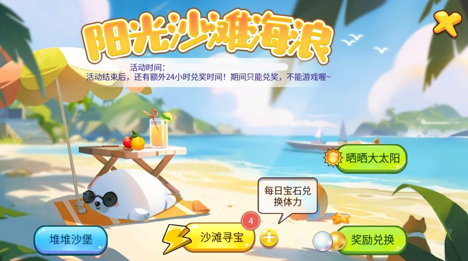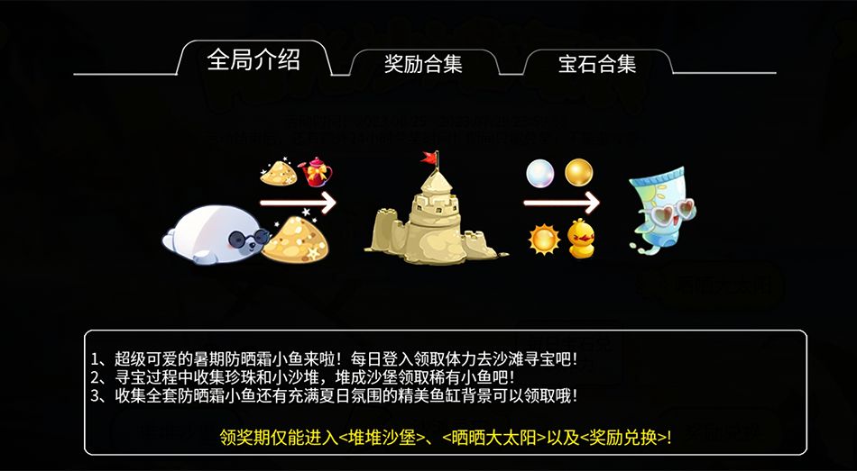 1、本活动分为四部分:沙滩寻宝、堆堆沙堡、晒晒大太阳、奖励兑换;