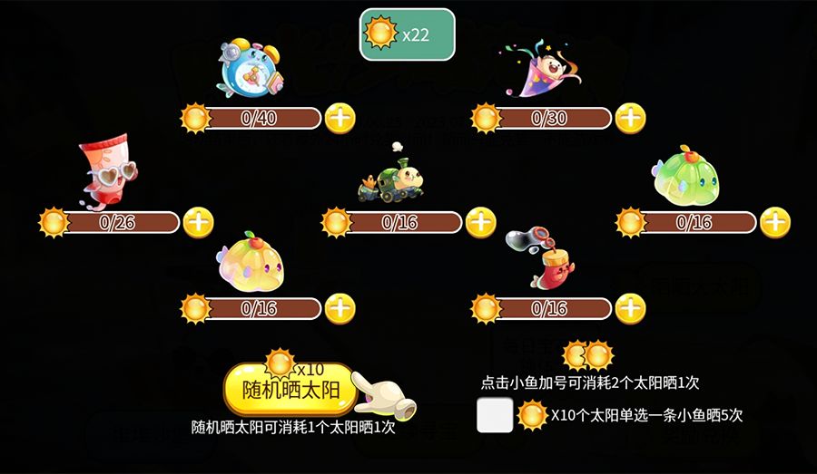 点击左侧随机晒太阳,或是点击鱼儿边上的加号为特定鱼儿晒太阳,太阳值满后可领取小鱼,注意活动很长,随机晒太阳更合适哦~