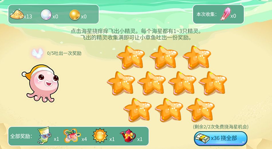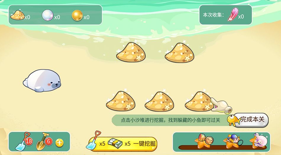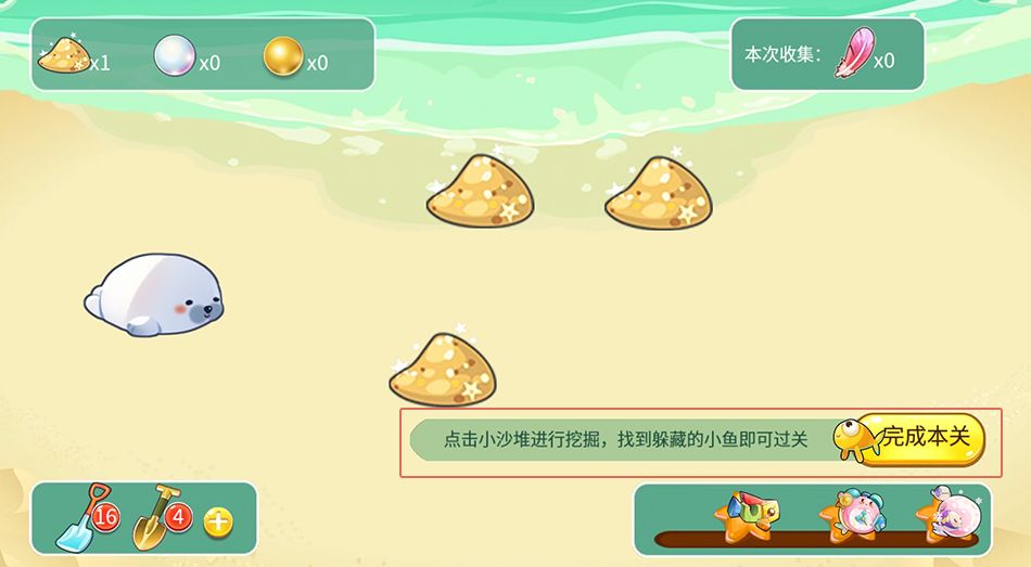 进入沙滩,点击沙堆开始寻宝,寻找到小鱼后即可进入下一片沙滩~